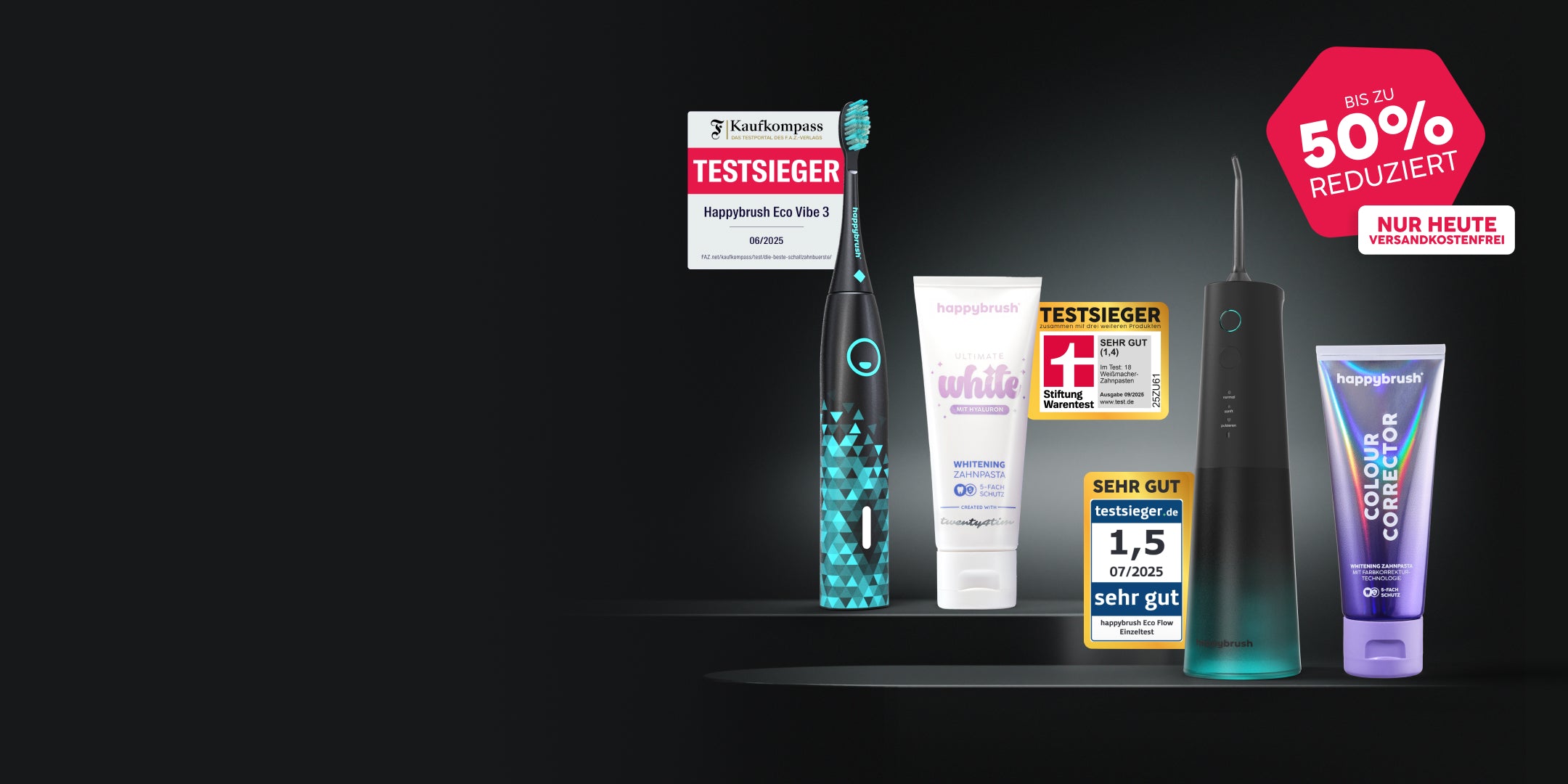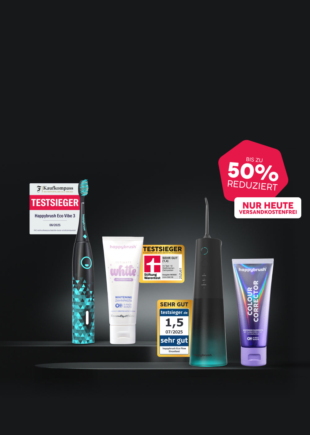 "Wir haben 21 Schallzahnbürsten getestet. Die beste ist die Happybrush Vibe 3. Sie überzeugt durch ein angenehmes Putzgefühl auch bei sensiblem Zahnfleisch, reinigt gründlich und hält im Urlaub ohne zwischenzeitliches Aufladen sechs Wochen durch."