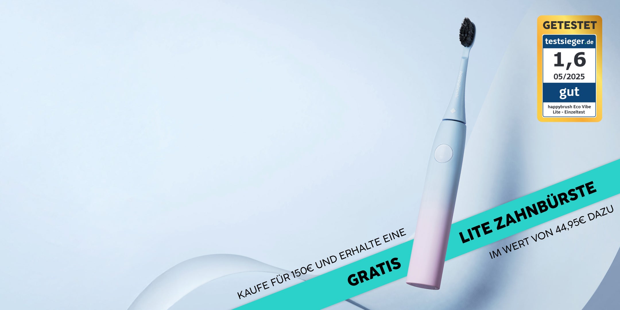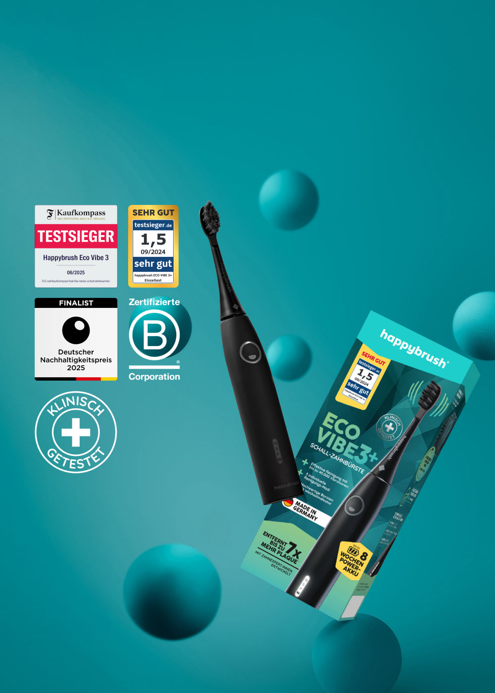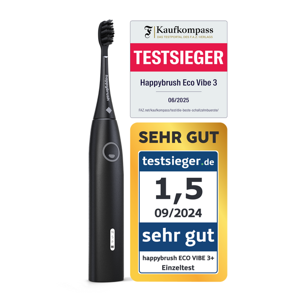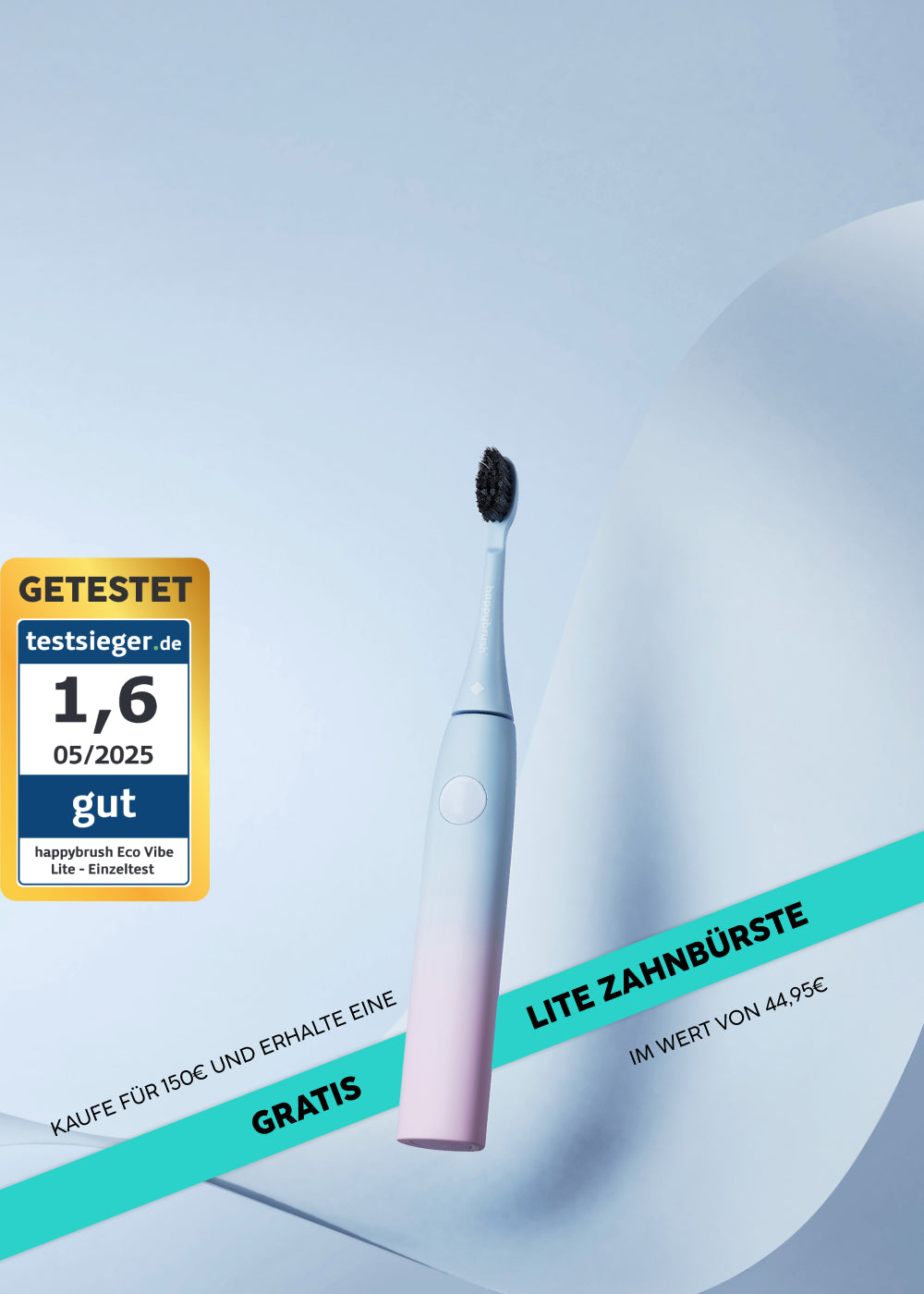 "Wir haben 21 Schallzahnbürsten getestet. Die beste ist die Happybrush Vibe 3. Sie überzeugt durch ein angenehmes Putzgefühl auch bei sensiblem Zahnfleisch, reinigt gründlich und hält im Urlaub ohne zwischenzeitliches Aufladen sechs Wochen durch."