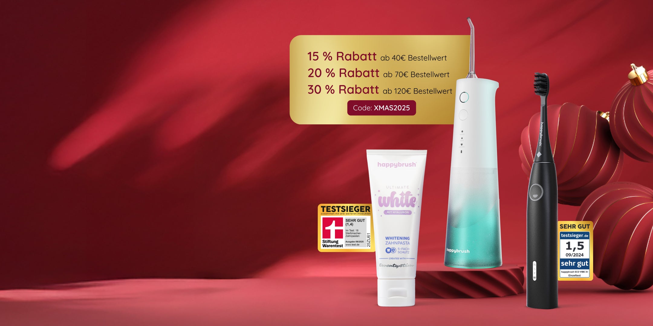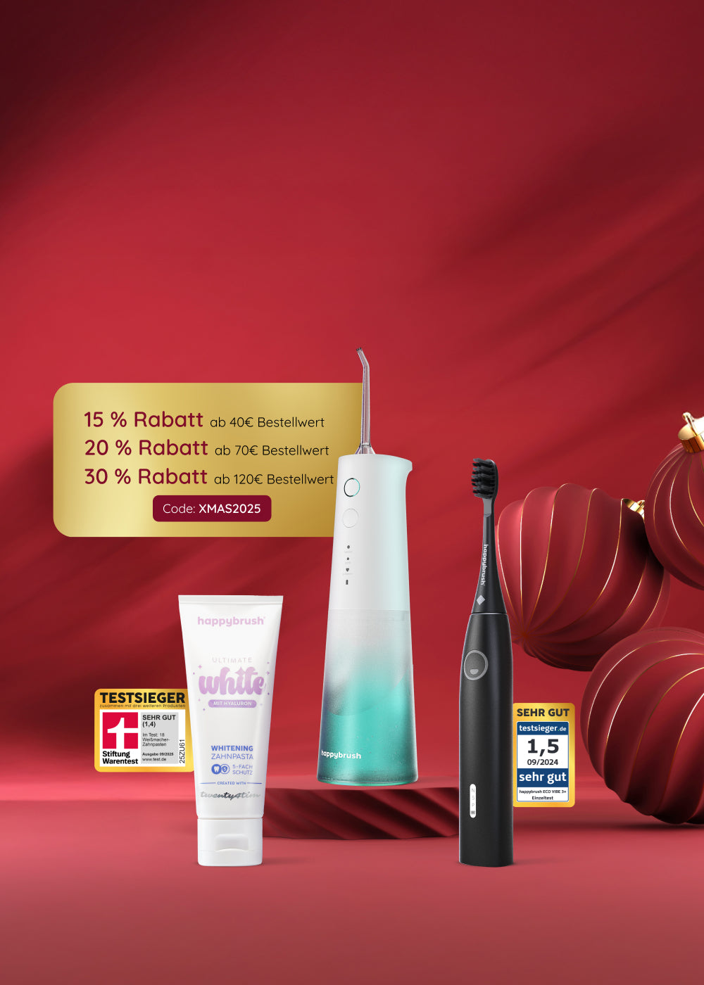 "Wir haben 21 Schallzahnbürsten getestet. Die beste ist die Happybrush Vibe 3. Sie überzeugt durch ein angenehmes Putzgefühl auch bei sensiblem Zahnfleisch, reinigt gründlich und hält im Urlaub ohne zwischenzeitliches Aufladen sechs Wochen durch."