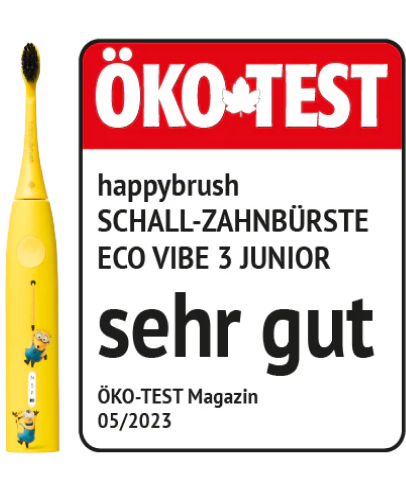 Ökotest zeichnet die happybrush Schall-Zahnbürste Eco Vibe 3 Minions als Testsieger mit der Note "sehr gut" unter den elektrischen Kinder-Zahnbürsten im aktuellen Test 05/2023 aus! Besonders die robuste Verarbeitung, die angenehmen Borsten und die sehr gute Handhabung werden im Test hervorgehoben.