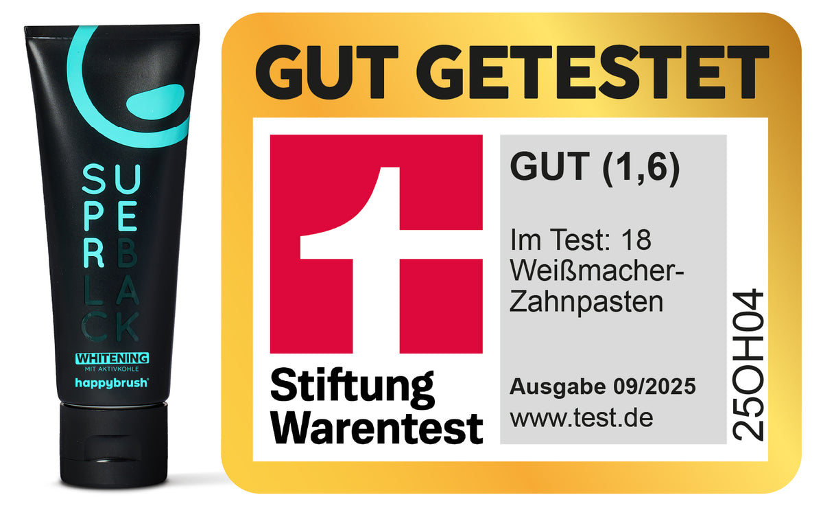 Stiftung Warentest hatte 18 Weißmacher-Zahnpasten getestet, darunter auch unsere SuperBlack Whitenng Zahnpasta. Abgeschnitten hat die Zahnpasta mit der Note Gut (1,6).