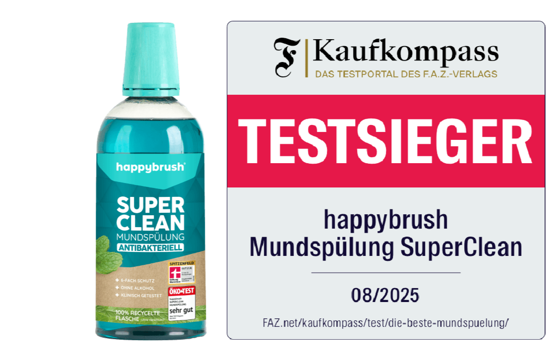 "Wir haben 12 Mundspülungen getestet. Die beste Lösung für die meisten ist die Happybrush Mundspülung SuperClean. Die verwendeten Wirkstoffe schützen vor Karies und Zahnfleischentzündungen, sorgen für weniger Plaque und hinterlassen nach dem Spülen einen angenehm frischen Minzgeschmack im Mund."