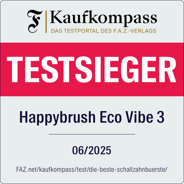 „Der erste Platz unseres Zahnbürsten-Tests geht an die Happybrush Vibe 3 [...]. Nicht nur das Design hat uns total angesprochen, auch die Qualität, Handhabung und die Firmenphilosophie der Schallzahnbürsten.“