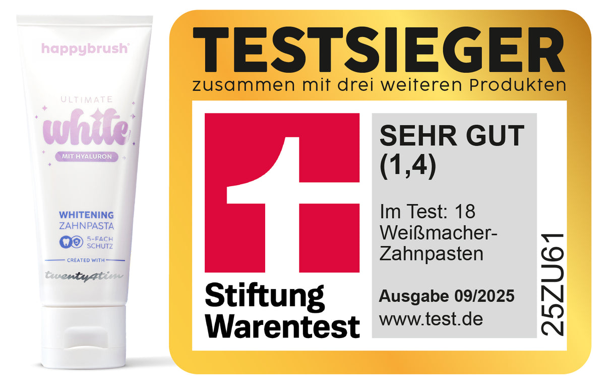 Stiftung Warentest hatte 18 Weißmacher-Zahnpasten getestet, darunter auch unsere Ultimate White. Abgeschnitten hat die Zahnpasta mit der Note Sehr Gut (1,4).