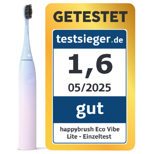 "Wir haben 21 Schallzahnbürsten getestet. Die beste ist die Happybrush Vibe 3. Sie überzeugt durch ein angenehmes Putzgefühl auch bei sensiblem Zahnfleisch, reinigt gründlich und hält im Urlaub ohne zwischenzeitliches Aufladen sechs Wochen durch."